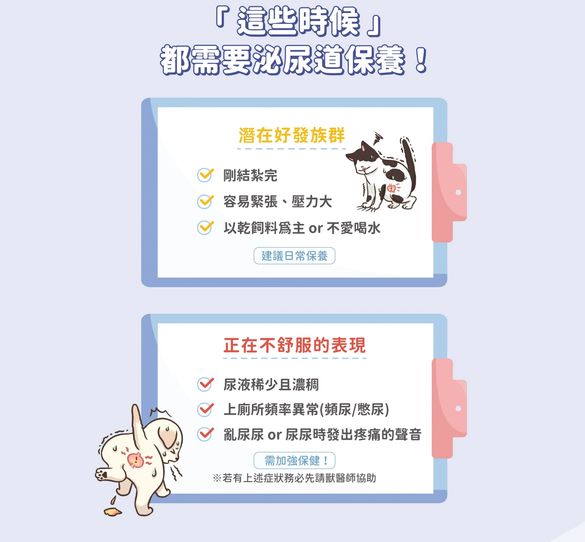 • 犬貓皆適用,建議平常多補充水分,輔以保健品補充泌尿道所需營養